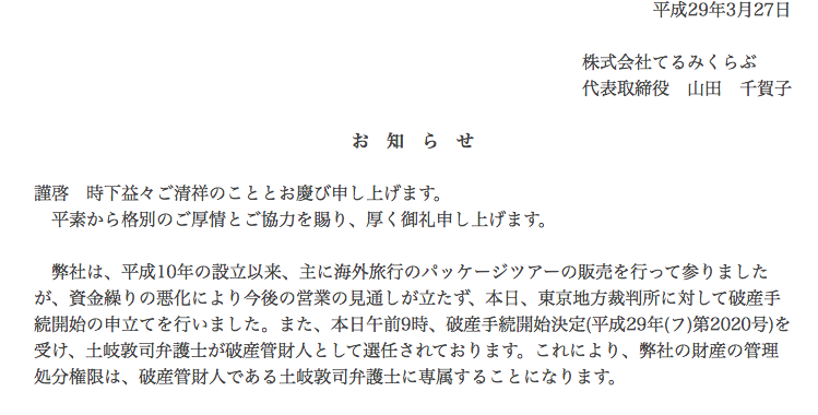 弊社は、平成10年の設立以来、主に海外旅行のパッケージツアーの販売を行って参りましたが、資金繰りの悪化により今後の営業の見通しが立たず、本日、東京地方裁判所に対して破産手続開始の申立てを行いました。また、本日午前9時、破産手続開始決定(平成29年(フ)第2020号)を受け、土岐敦司弁護士が破産管財人として選任されております。これにより、弊社の財産の管理処分権限は、破産管財人である土岐敦司弁護士に専属することになります。