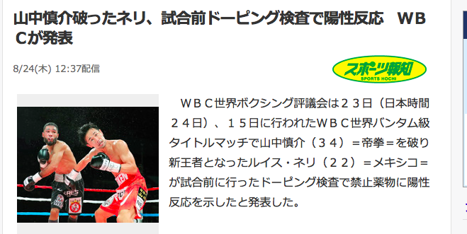 WBC世界ボクシング評議会は23日(日本時間24日)、15日に行われたWBC世界バンタム級タイトルマッチで山中慎介(34)=帝拳=を破り新王者となったルイス・ネリ(22)=メキシコ=が試合前に行ったドーピング検査で禁止薬物に陽性反応を示したと発表した。