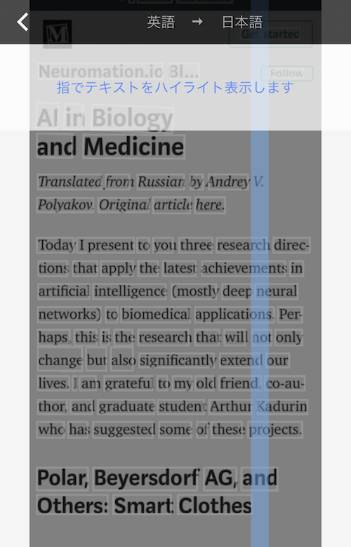 翻訳して欲しいところを、指でなぞってタップすると